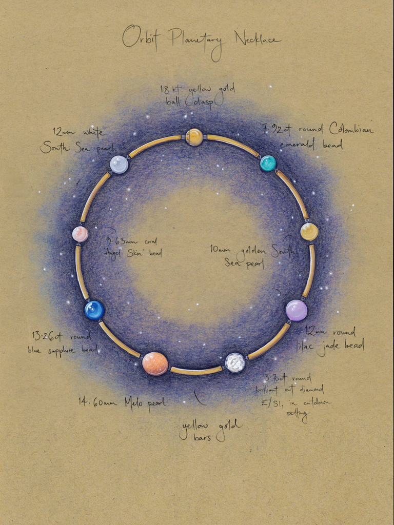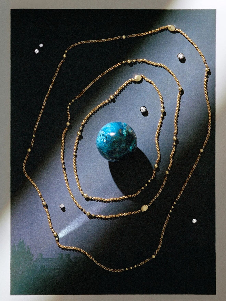 Incorporating the Victorian jewellery-making techniques synonymous with our designs, Orbit pays tribute to the 19th century’s golden age of astronomy. The era’s fascination with stargazing was motivated by significant celestial events, including the discovery of Neptune in 1846, which brought cosmic motifs to the forefront of jewellery design, fashion, and home décor of the time. Orbit plays with spherical shapes and astronomical themes to juxtapose antique traditions and Jessica’s irreverent approach to luxury.