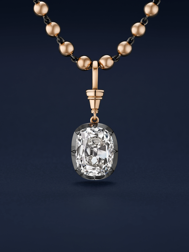 This one-of-a-kind high jewellery pendant features the exceptional Old Mine cut Lyra diamond. The Ball n Chain design allows the characterful SI1 diamond, weighing over 10cts, to take centre stage, set in an 18K blackened white gold Georgian cut down setting that contrasts beautifully with the glowing G colour of the stone. Chosen for its unique faceting and soft light performance, the diamond has a generous spread, giving it a presence beyond its carat weight.