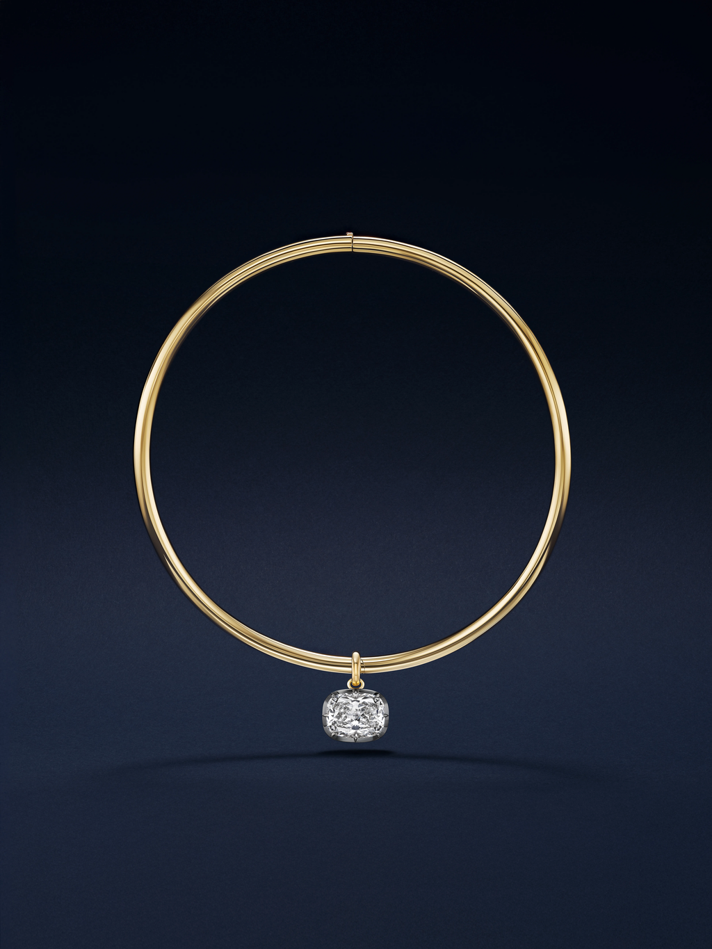 The Torque’s sleek design is made with a beautifully discreet catch clasp and gold wire complete with thick interior walls. With a very generous spread, the colourless diamond is both exceptionally rare and eye-catching.