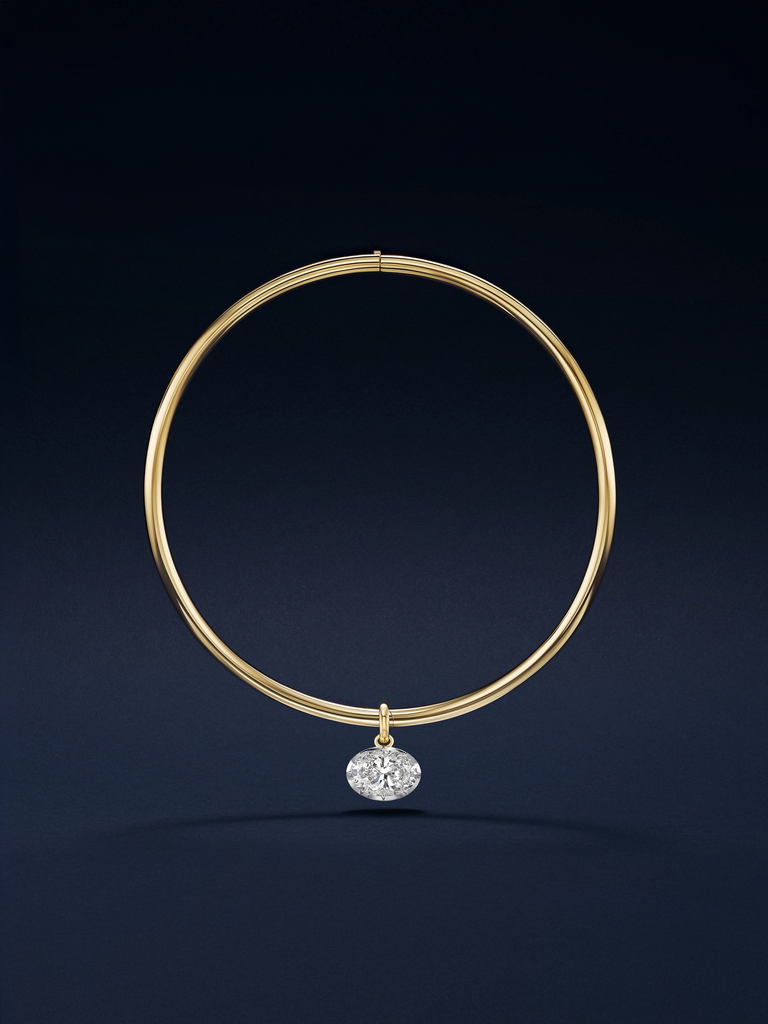 This one-of-a-kind Torque pendant showcases the Oval cut Ellipse diamond, set in an 18K white gold Georgian cut-down setting. The D color, VS2 diamond, weighing over 20cts, is backed in 18K white gold to enhance its exceptional light performance and is suspended from our 18K yellow gold Torque, falling elegantly between the collarbones.