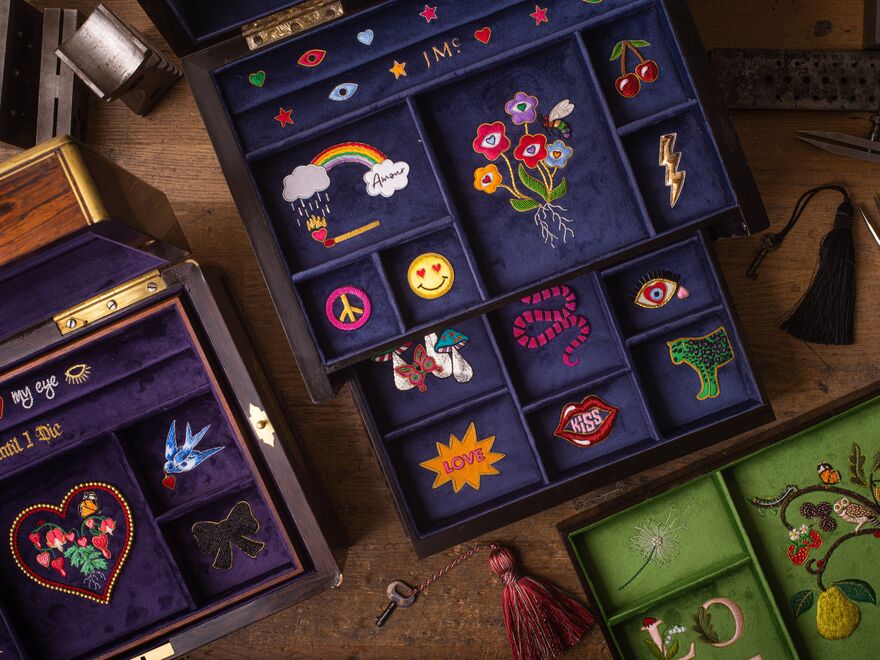 We will organise a consultation with a member of the team where you will be able to choose your Heirloom Jewellery Box from a curated selection of antique boxes. You will work side by side with the JMc design team and be presented a series of embroidery samples and questions to start the design process.