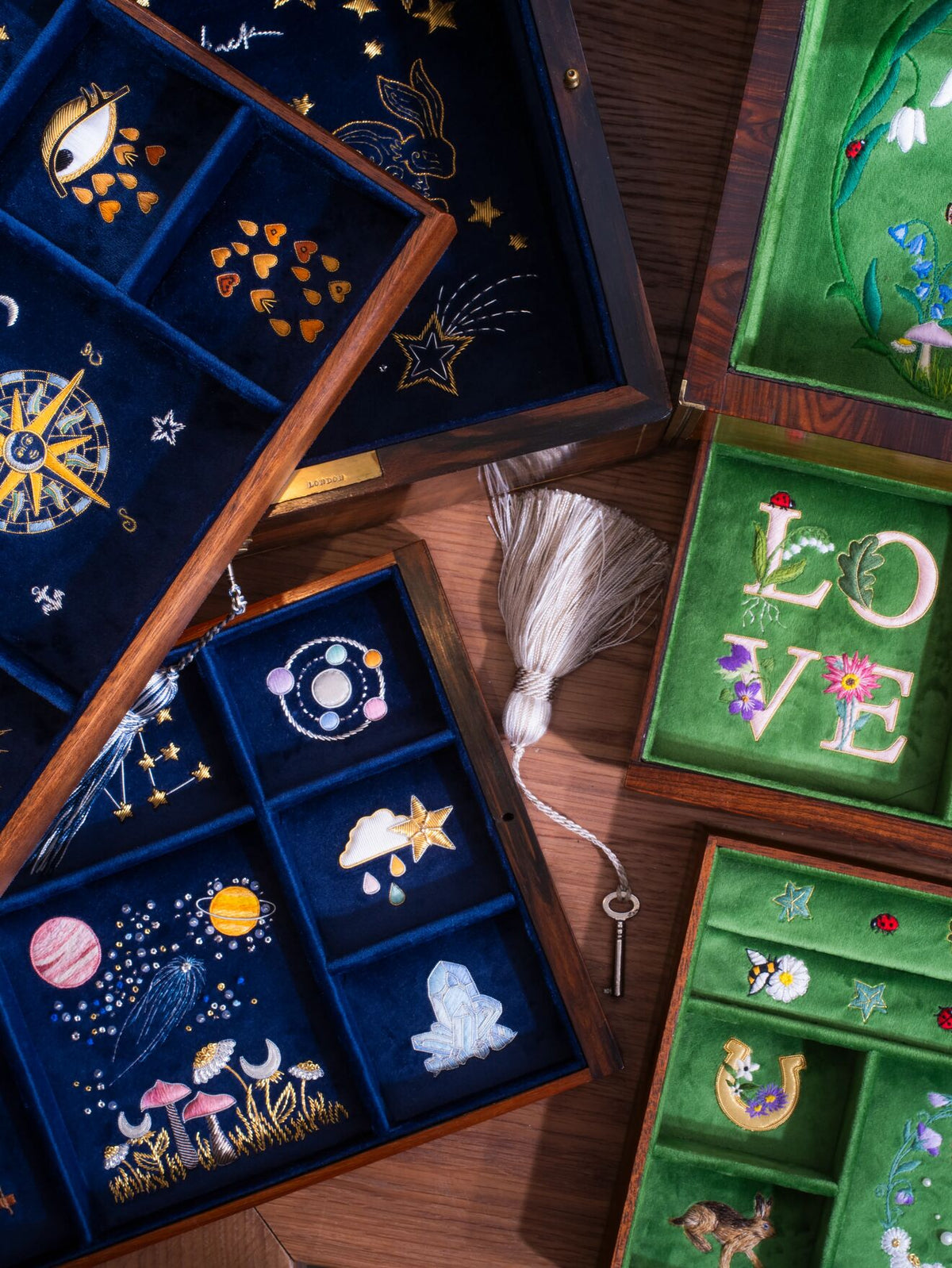 Our beautiful Jewellery boxes create a home for these treasured pieces, ready to be unlocked at important moments, on special occasions and on meaningful anniversaries. Be it a cosmic journey, a secret garden or a trip across the high seas each box features hand-embroidered illustrations inspired by Jessica’s signature motifs; hearts, birds, stars, and wings to name a few.