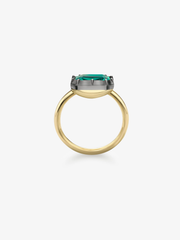 An East-West Emerald Cut Emerald Button Back Ring with a 2.89ct Emerald Cut Emerald, set in a Georgian style cut-down setting in 18K blackened white gold & yellow gold.