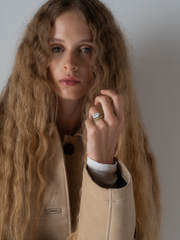 An East-West Diamond Button Back Ring with a 3.51ct Oval cut diamond, set in a Georgian style cut-down setting in 18K blackened white gold & yellow gold.