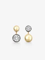 A pair of Orbit Asymmetric Yellow Gold & Diamond Sphere Earrings, one half of the pair with a 4.17ct Round Brilliant cut diamond & the other with a 1.51ct Round Brilliant cut diamond, set in a Georgian cut-down setting in 18k blackened white gold & yellow gold.