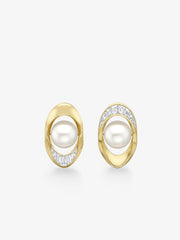 A pair of Orbit Pearl & Diamond Earrings, with two 14mm pearls and a set of Carré-Cut diamonds surrounding the pearls, set in 18K white gold & yellow gold.